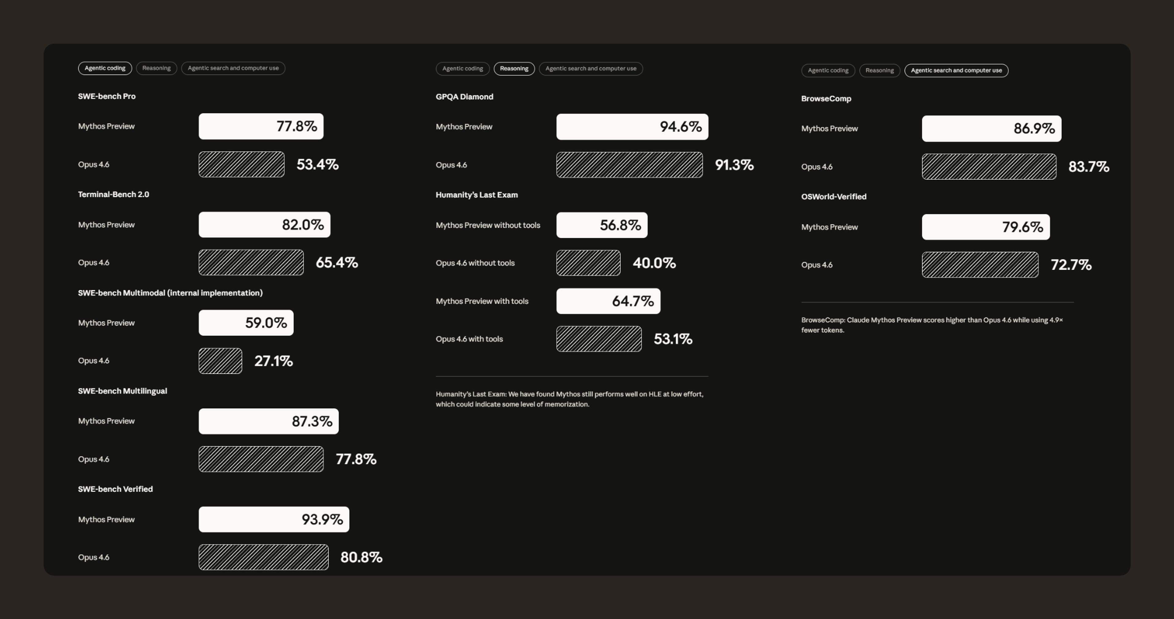 The general benchmark picture makes this harder to wave away as a narrow security demo. The system card reports 93.9% on SWE-bench Verified, 94.5% on GPQA Diamond, 97.6% on USAMO 2026, and 79.6% on OSWorld. Anthropic also says Mythos still does not clear its automated AI-R&D threshold, which keeps the frame grounded: this is a cyber threshold event first.
