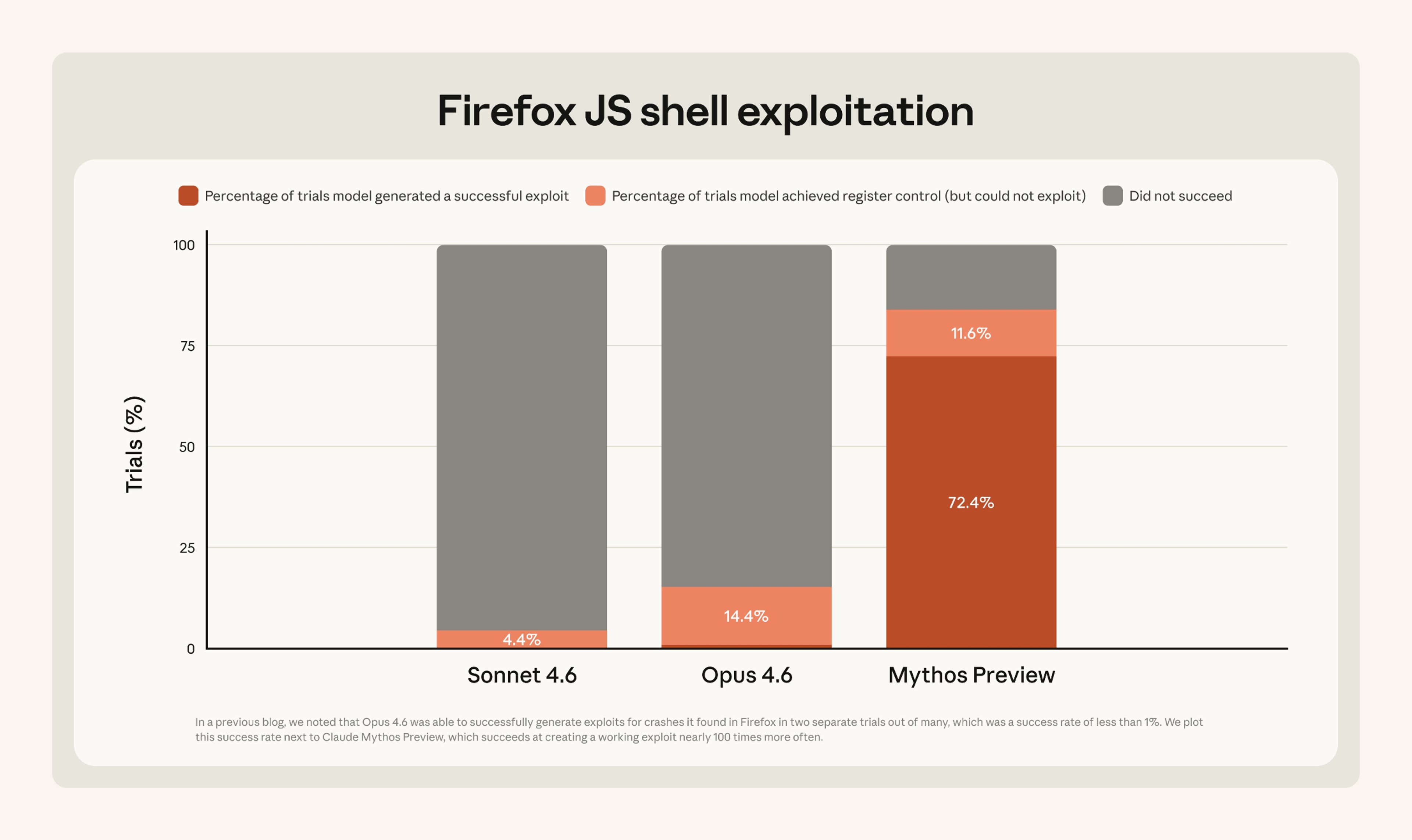 Mythos abilities appear to have fallen out of general progress. In Anthropic’s technical writeup, the company says it did not explicitly train Mythos for cybersecurity. The capability emerged from better code, reasoning, and autonomy. Anthropic also says Mythos can identify and exploit zero-days across every major operating system and browser, found a 27-year-old OpenBSD bug and a 16-year-old FFmpeg bug, and turned Firefox 147 crashes into working exploits 181 times, versus 2 for Opus 4.6. (Red Anthropic)