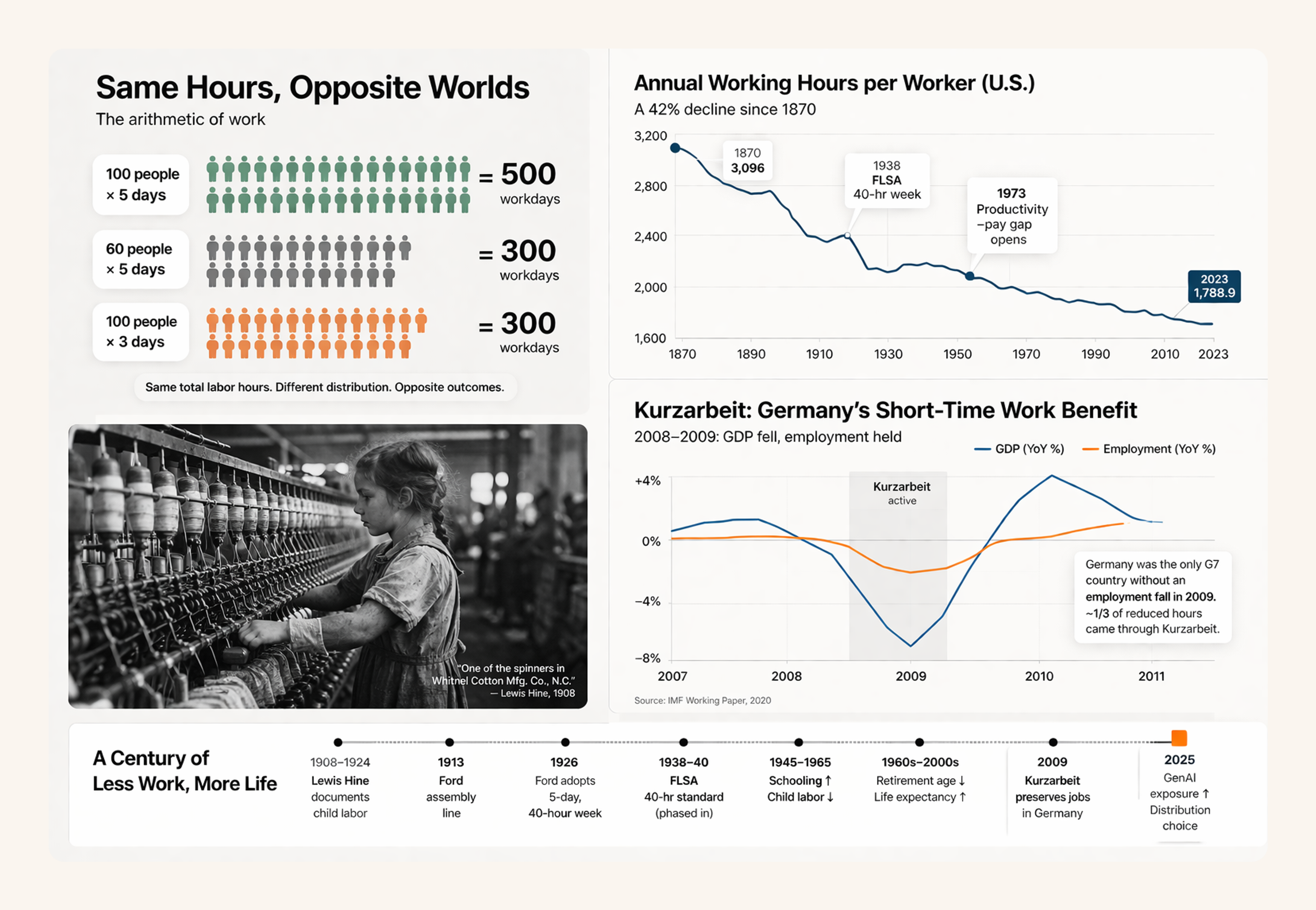 Work-Sharing Has History. Ford’s shorter day, the 40-hour week, longer schooling, retirement systems, and Germany’s Kurzarbeit all show that societies can decide to spread a reduction in necessary labor across the population instead of concentrating it in layoffs. Shared leisure is not a law of nature. It is a settlement.