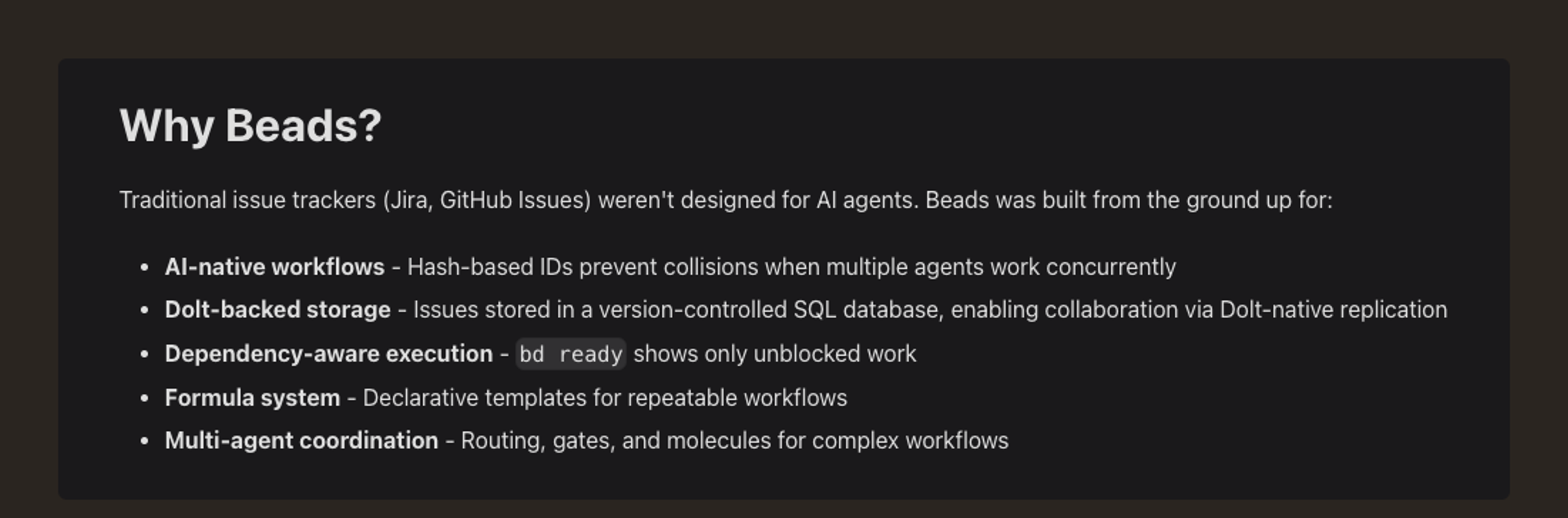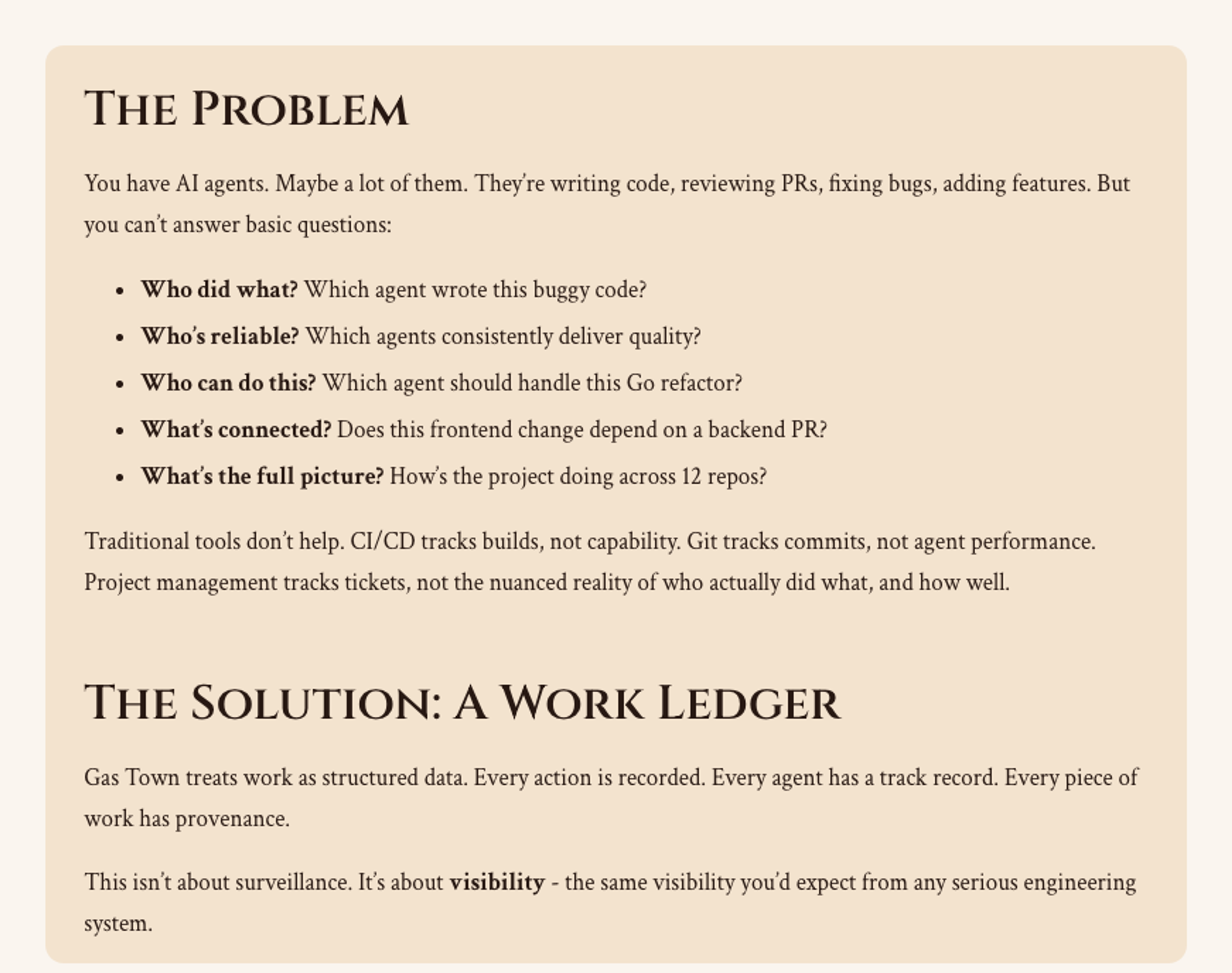 - Strong provenance. Commits, beads, and town events can all be attributed and queried.