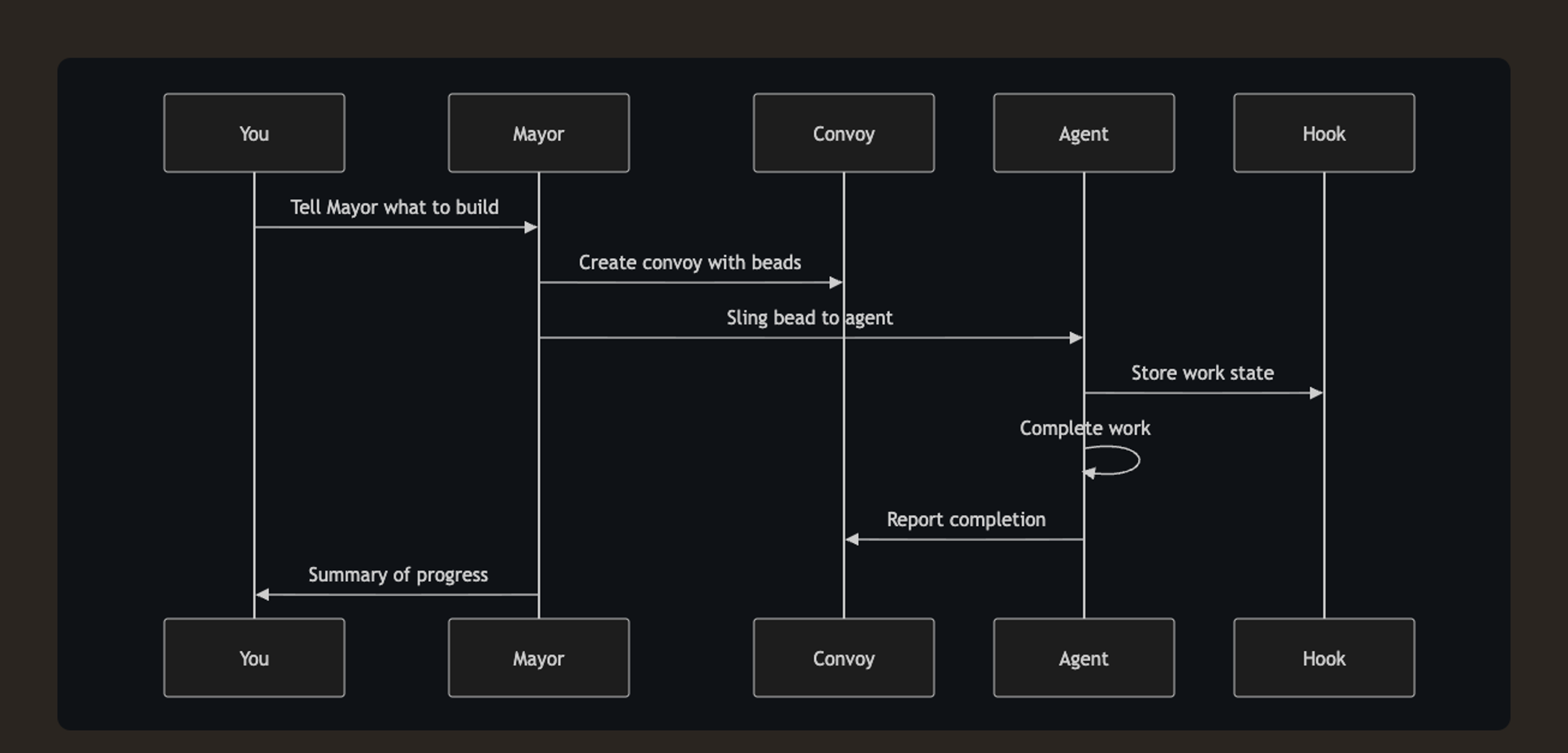 A rig is a project container. A bead is a work item in the Beads system. A convoy tracks related work (the docs explicitly say to use one even for a single issue). A hook is attached work that survives restarts, handoffs, and context compaction. (Gas Town Docs)