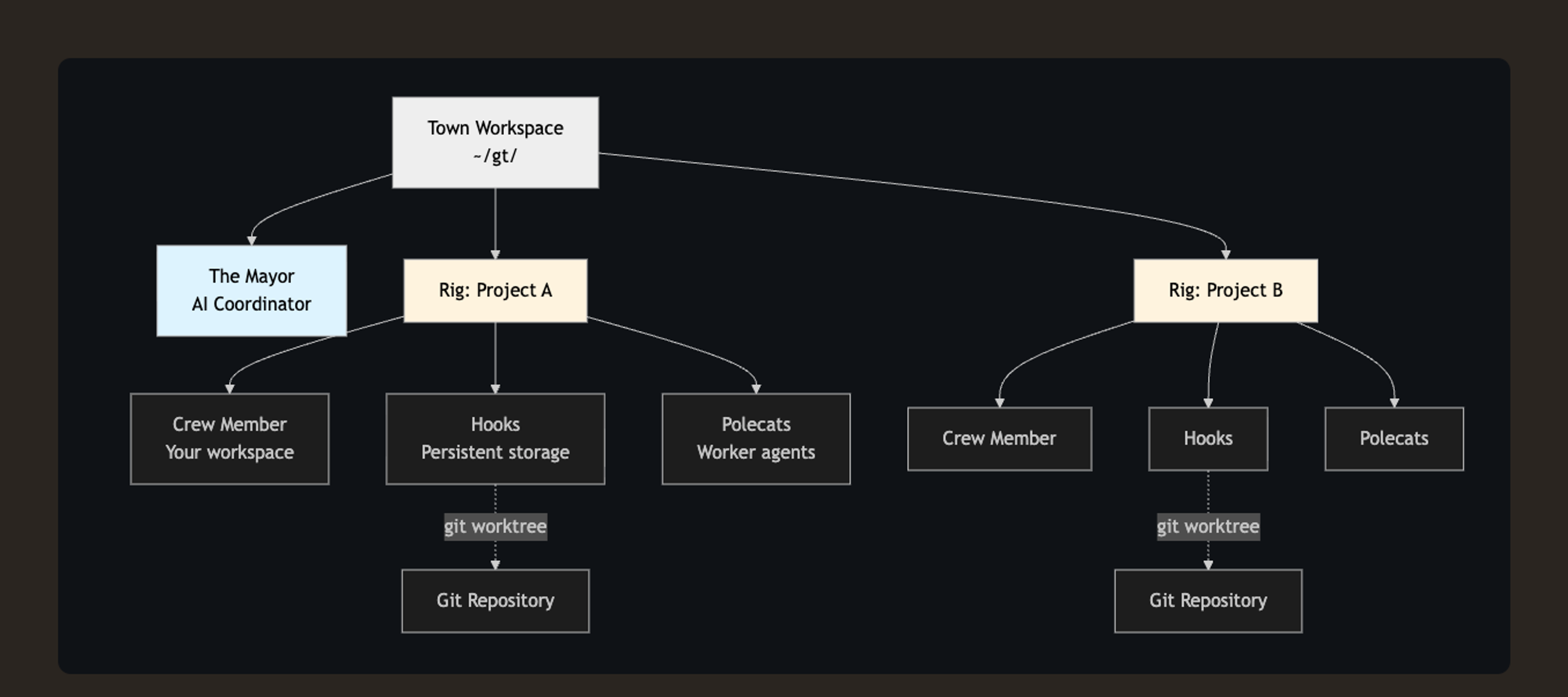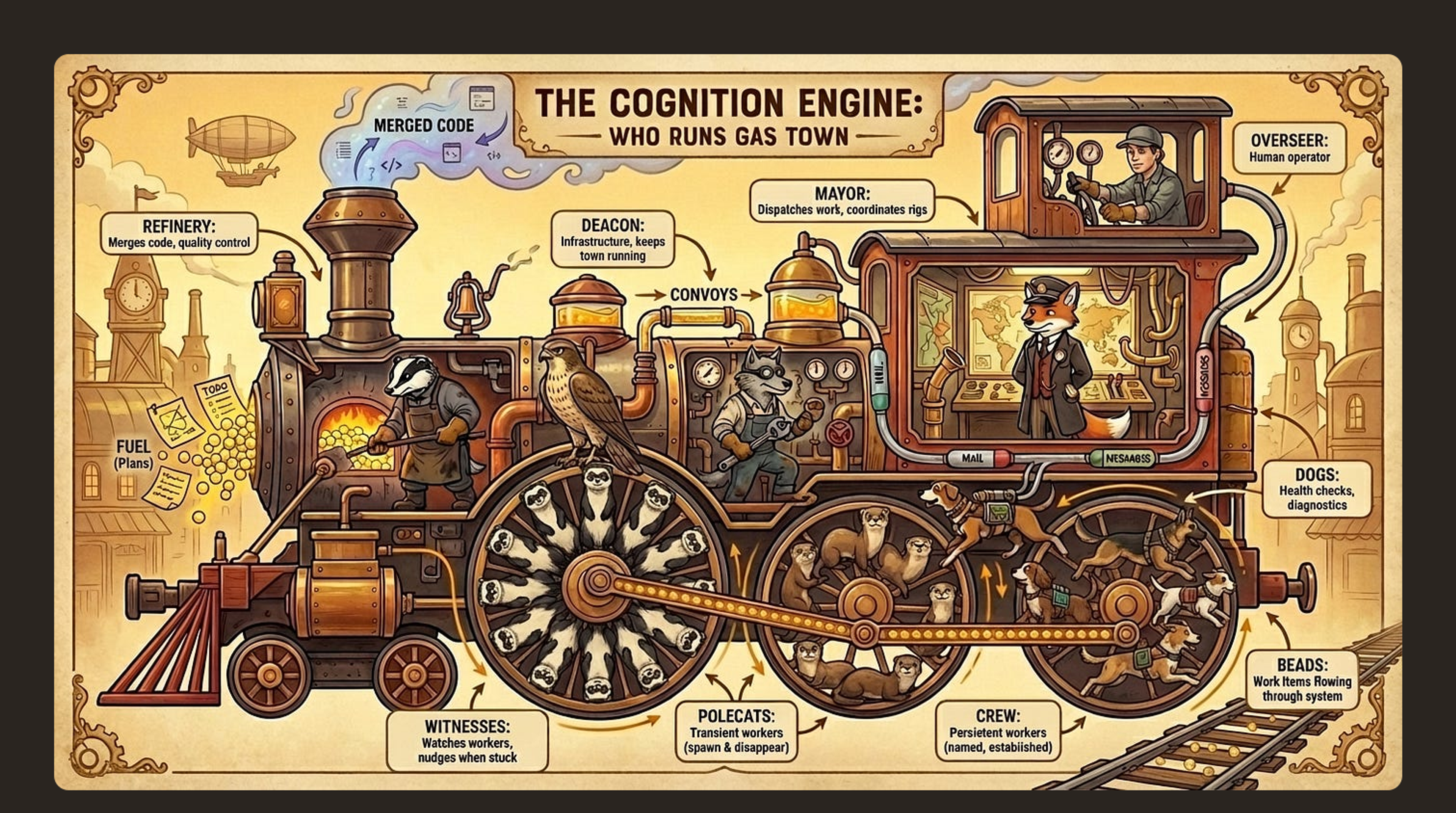 The animal names are whimsical, but the roles are not. The Mayor coordinates work across the town. Crew are long-lived named workers. Polecats are transient workers for discrete tasks. Witness manages polecats per rig. Refinery handles merge processing. Deacon and its dogs keep the system healthy (dogs are not for user work). (Gas Town Docs)
